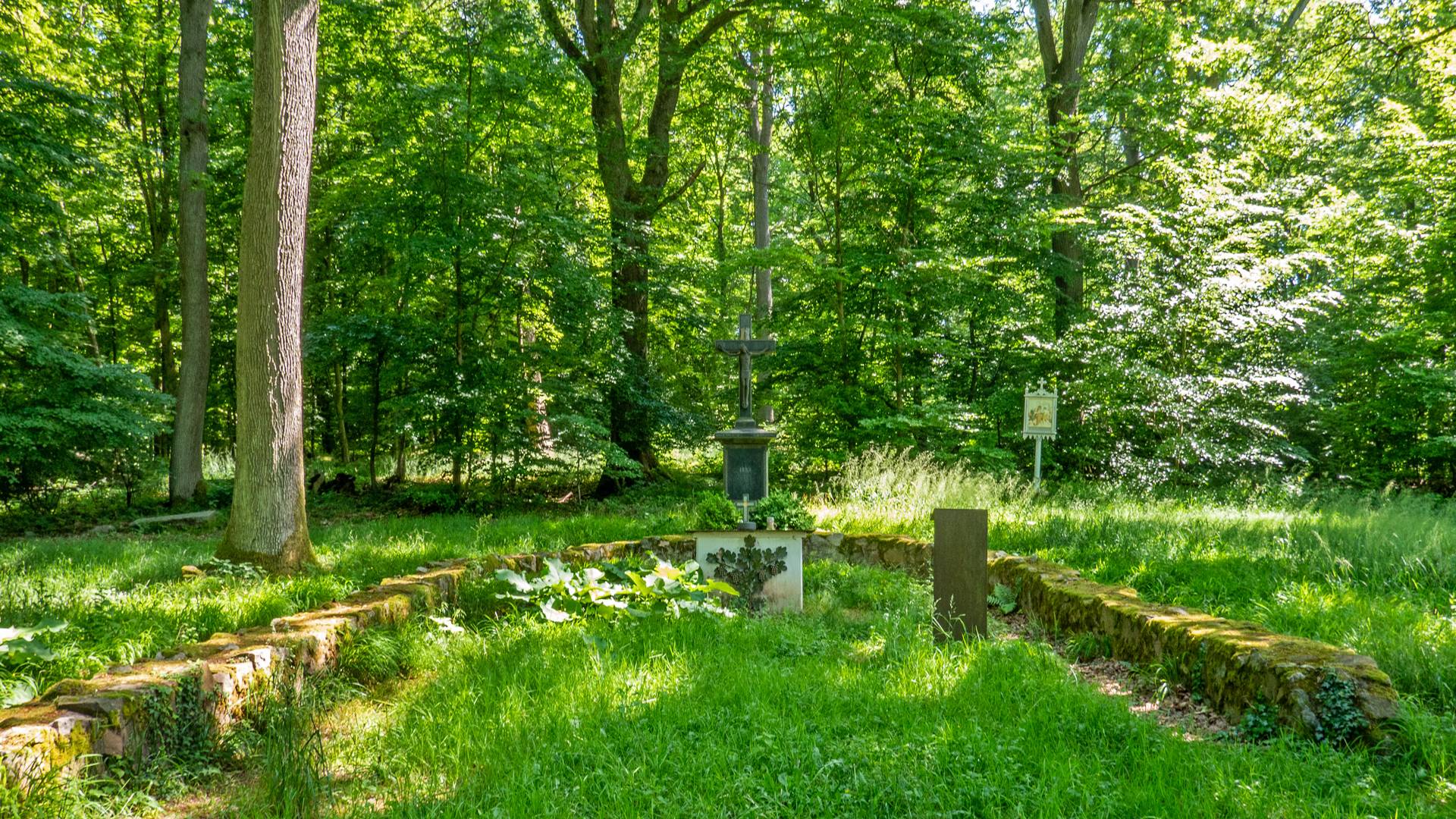 Es dauert nicht lang und die Kalorien der Kirschen werden im nächsten Anstieg schon wieder in Beinleistung umgesetzt. Schritt für Schritt arbeite ich mich zur Wallfahrtsstätte Kreuzberg nach oben. Oben auf dem Kreuzberg angekommen, finde ich die Reste einer Kapelle, ein Altarkreuz und vierzehn gusseiserne Stationsbilder vor. Der Infotafel zu folge, sollen sich aber schon lange vor Christus die Heiden hier oben getroffen haben. Mir ist es aber wurscht, wer sich hier und warum getroffen hat. Mein Magen meldet sich und ich möchte einen schönen Rastplatz in der Sonne haben.
