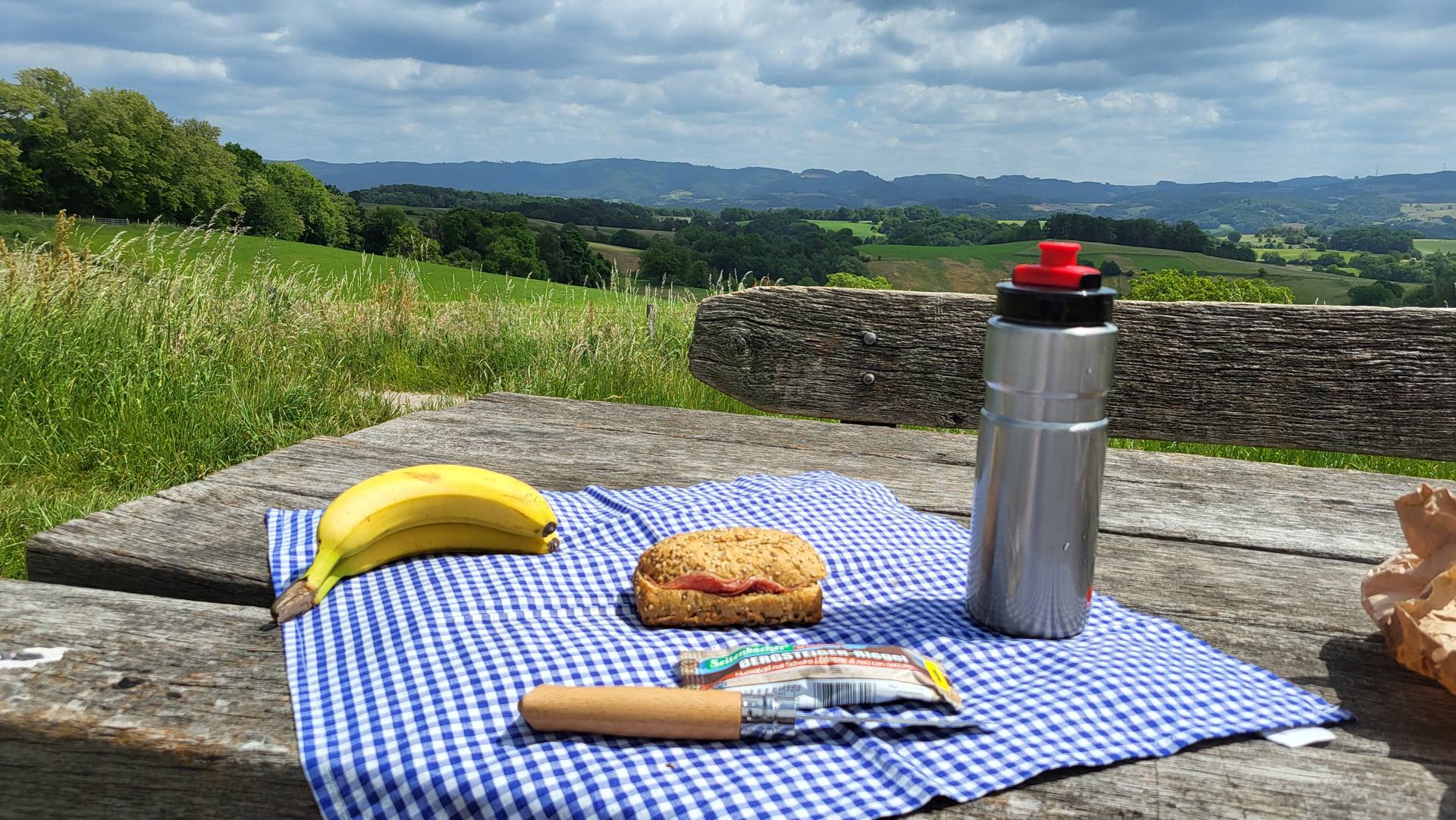 Es hat sich absolut gelohnt, noch bis zum Waldnerturm weiterzugehen. Nicht nur, dass meine Laune dank der Sonne einfach quietschen möchte vor Freude, von hier oben ist die Aussicht ins Rheintal und in den Odenwald einfach nur bezaubernd. Jetzt noch meine Tischdecke auf den Tisch, den Tee und das belegte Brötchen dazu, was will „Mann“ mehr.