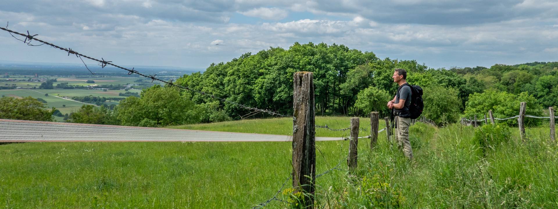 Am Parkplatz Schaumesklingel komme ich wieder aus dem Wald heraus. Auch hier ist die Aussicht weit über die sanfte Hügellandschaft traumhaft. Und dann steht da auch noch eine Bank in der Sonne, passend für die Pause. Der Rucksack nimmt schon mal auf der Bank Platz, während die Augen in der Ferne einen Turm und ein paar Bänke entdecken. Schnell ist der Umzug zum Turm beschlossen, der Rucksack wieder auf dem Rücken und die Füße bewegen sich auf die weite Ebene hinunter.