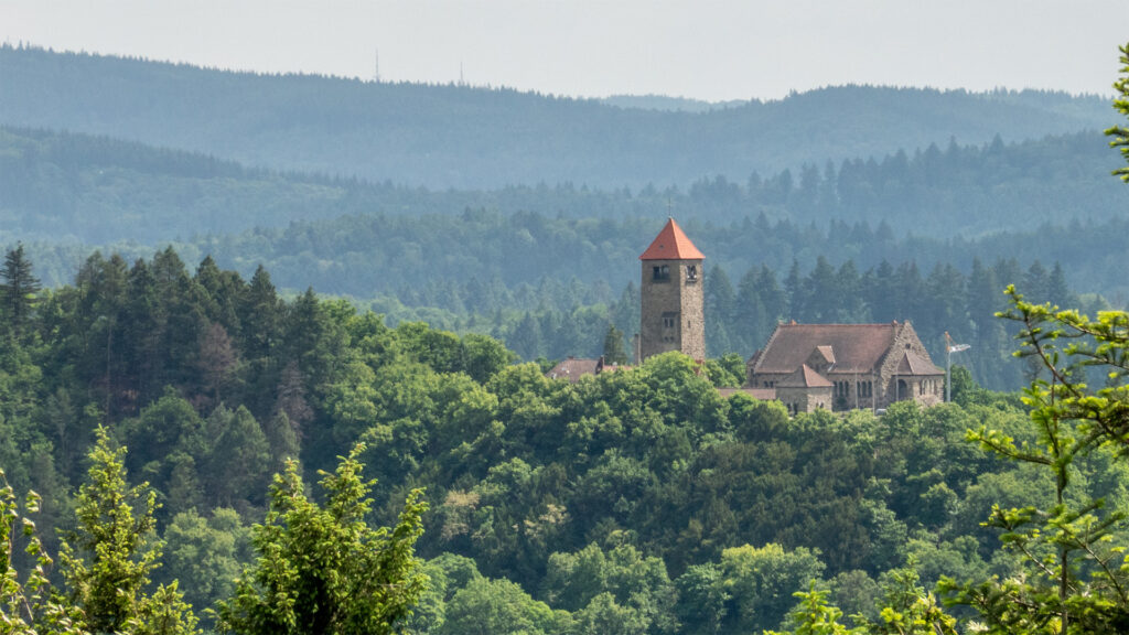 Bevor ich die erste größere Stadt am Burgensteig in Baden-Württemberg erreiche, geht es nochmal knapp 200 Höhenmeter zum Hirschkopf hinauf. Auf dem 345 Meter hohen Hirschkopf, steht der gleichnamige, 15 Meter hohe Aussichtsturm. Klar, dass ich dies Höhenmeter zum Turm hinauf auch noch mitnehmen muss. Frostig und windig ist es hier oben. Da muss ein kurzer Blick über den Odenwald und die Rheinebene bis in die Pfalz reichen.