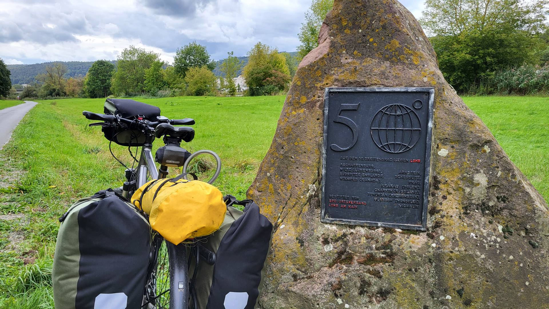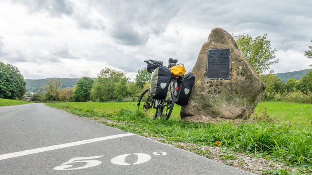 Für die letzten Kilometer begleitet mich nun der Main. Ein obligatorischer Fotostopp auf dem 50. Breitengrad muss jetzt noch sein. Auf diesem Breitengrad liegen Ulaangom in der Mongolei, Winnipeg in Kanada und auf der anderen Mainseite, mein nächster Campingplatz in Lohr. Noch einen großen Bogen über die Brücke und an der Altstadt von Lohr vorbei, dann stehe ich an der Rezeption.
