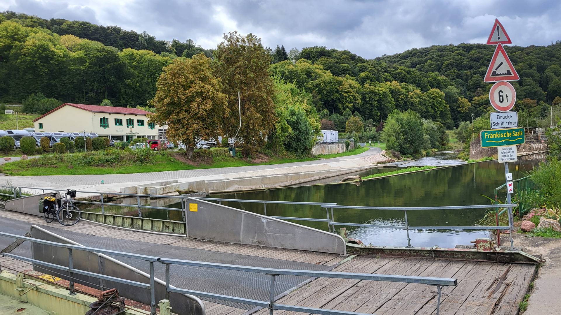 Nach Hammelburg wird das Tal der Fränkischen Saale noch ein Stück enger und noch ländlicher. Es rollt leicht und locker vor sich hin und ab und an lockert eine kurze Steigung die Tretroutine etwas auf. Schon nach wenigen Kilometern ist der nächste Stopp angesagt. Der Campingplatz Rossmühle in Weikersgrüben war früher unser Standort für Kanutouren. Auf der alten Fähre stehend, die festgemacht hier als Brücke dient, schaue ich auf die große Wiese für die Gruppen und denke an die vielen Abenden in der Gemeinschaft am Lagerfeuer.