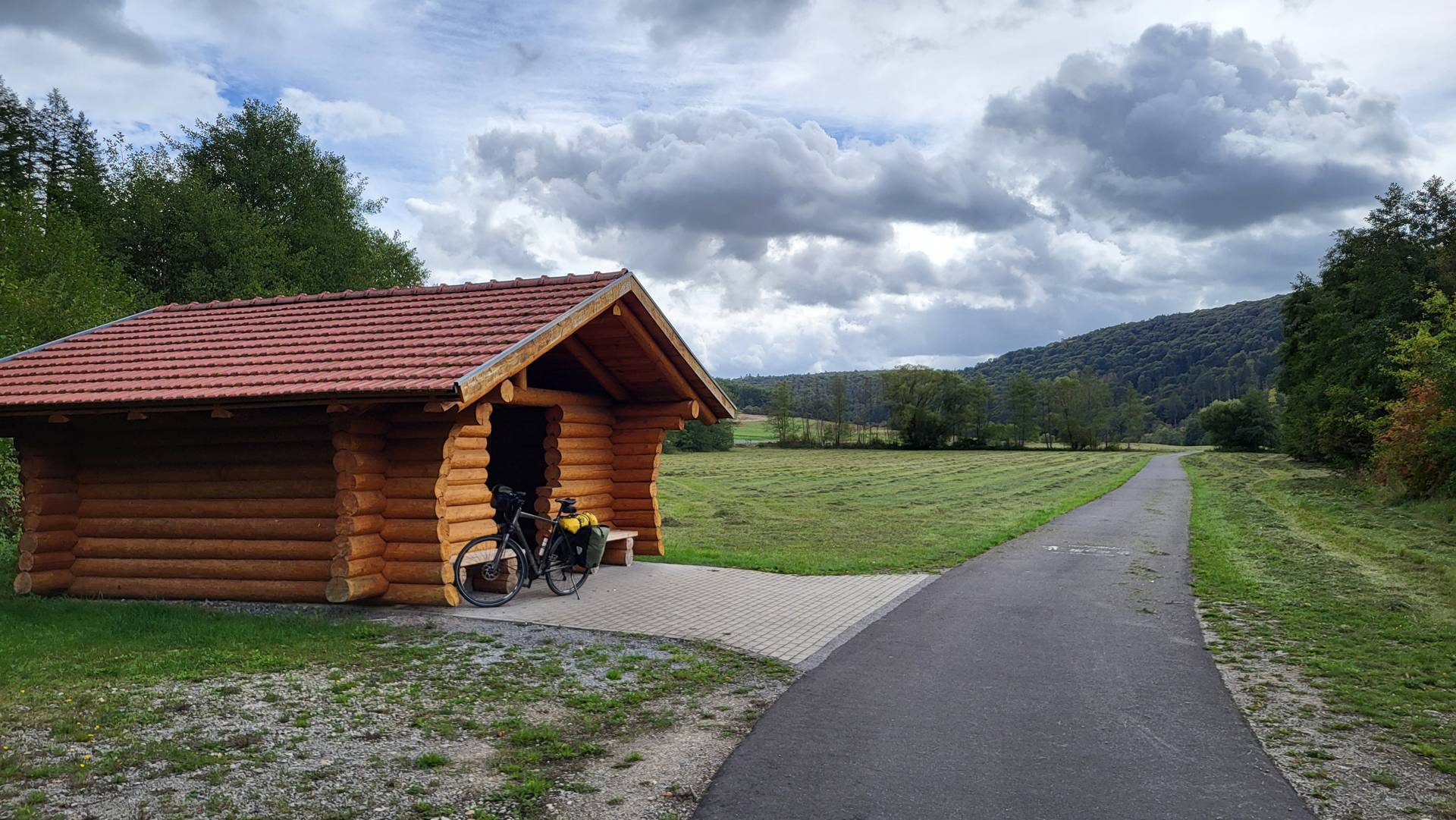 Angeblich liegt die Region ja im Windschatten der Rhön. Na dann schaumama. Auf die mondäne Kurstadt folgt sehr schnell unterfränkisches Landidyll. Der Radweg mäandert mit der Saale das Tal hinunter. Mal zeigt sich das Flüsschen, mal versteckt sie sich scheu hinter Bäumen und Büschen.