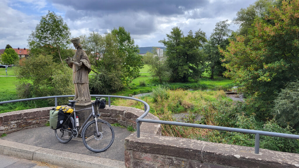 So, nun ist‘s genug mit der Geschichte. Ich will weiterfahren. Auf der Saalebrücke bei Elfershausen, treffe ich den Schutzpatron für Brücken, Schiffer, Flößer und Beichtväter. In Stein gemeißelt hält er Wacht vor den Gefahren des Wassers. Irgendwie mag ich den Johannes Nepomuk. Er wacht über die Brücken, die ich als Reisender als Verbindung so schätze.